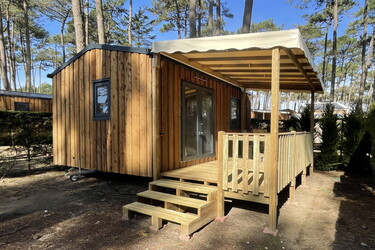 Laissez-vous séduire par notre cabane en bois ! Chaleureuse en toute saison, la cabane en bois vous permettra de retrouver confort et bien-être grâce à son intérieur cosy. Vous serez au plus proche de la nature avec le confort d'une cabane équipée. D’une superficie de 20 m², elle peut accueillir une famille de 4 ou 5 personnes. Elle est composée de 2 chambres. Une avec un lit double et l'autre avec 2 lits superposés et 1 lit gigogne. La cabane possède une kitchenette équipée : plaque de cuisson, cafetière... En plus de la kitchenette, vous trouverez dans la pièce principale une table et des chaises. Vous n’avez pas de douche, mais des WC séparés. Pour profiter du soleil vous disposez de deux chiliennes.